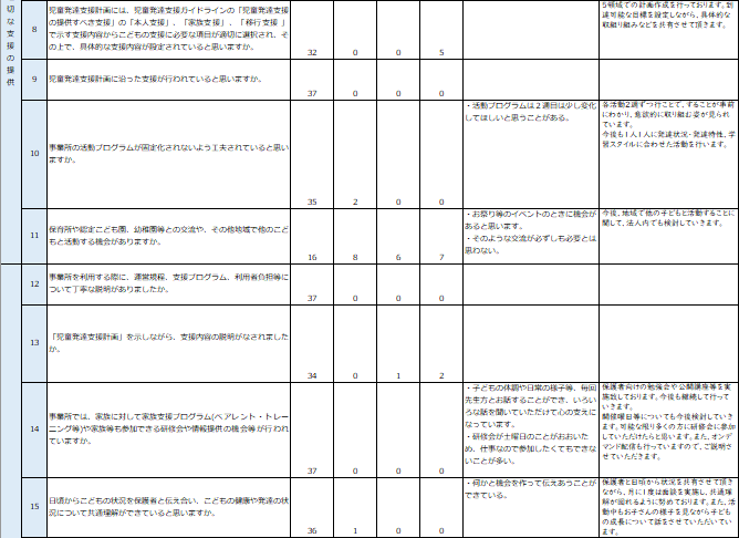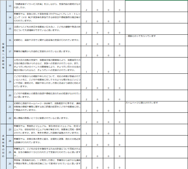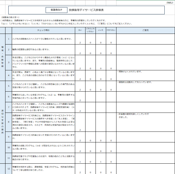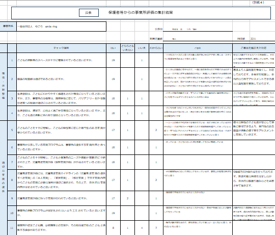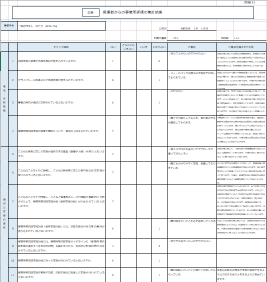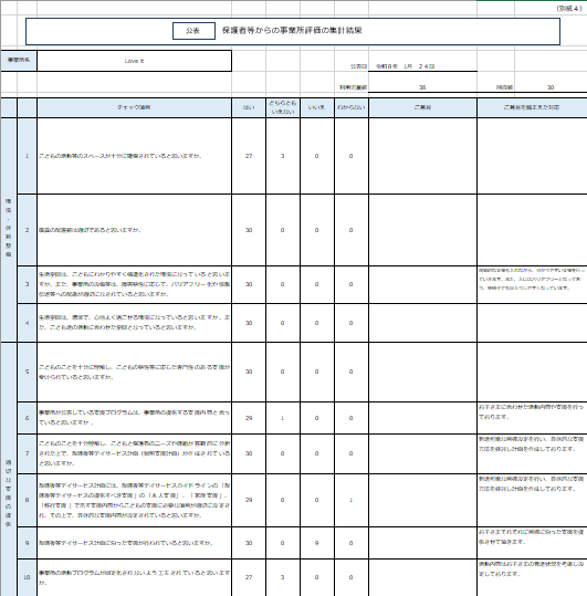 令和7年度 事業所評価表 当事業者は児童発達支援ガイドライン・放課後等デイサービスガイドラインに基づき、自己評価及び保護者評価を行い、その結果と改善内容を公表することが義務付けられています。 Smile ring 事業所評価 Love it 事業所評価 irodori 事業所評価 トップぺージ Smile ring ご利用料金について お問い合わせ Love it irodori 離乳食パウダー ひとさじ ひとさじ商品詳細 会社概要 所在地 新着情報 ご利用までの流れ 事業所評価表