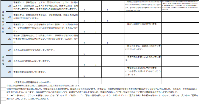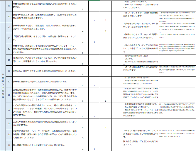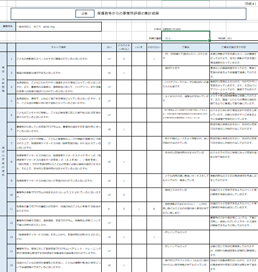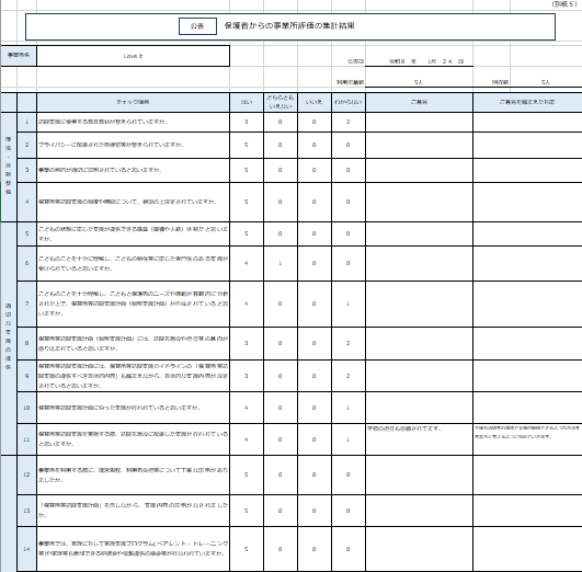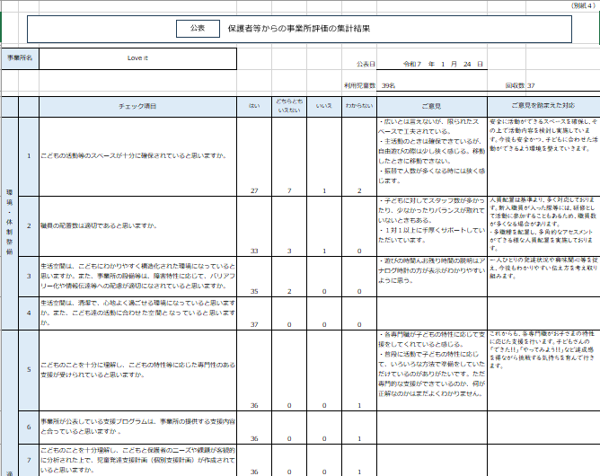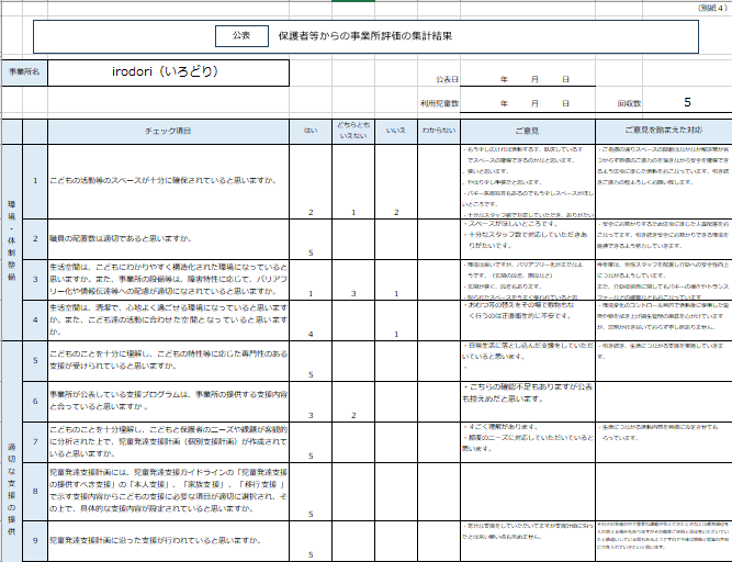 令和7年度 事業所評価表 当事業者は児童発達支援ガイドライン・放課後等デイサービスガイドラインに基づき、自己評価及び保護者評価を行い、その結果と改善内容を公表することが義務付けられています。 Smile ring 事業所評価 Love it 事業所評価 irodori 事業所評価 トップぺージ Smile ring ご利用料金について お問い合わせ Love it irodori 離乳食パウダー ひとさじ ひとさじ商品詳細 会社概要 所在地 新着情報 ご利用までの流れ 事業所評価表